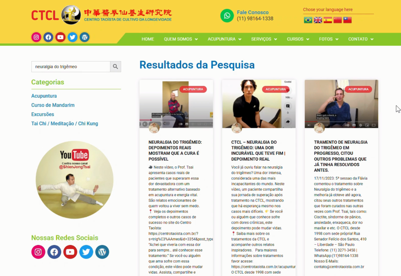 22/12/2025: Claudia já havia passado por outro acupunturista que aplicava muitas agulhas diretamente nos joelhos, seguindo a ideia de tratar apenas o local da dor. Porém, a verdadeira acupuntura vai além: busca a raiz do problema para restabelecer o equilíbrio do corpo. No tratamento com o Prof. Tsai, nenhuma agulha foi colocada nos joelhos. Em apenas 4 sessões, Claudia já apresentou uma melhora de 60%. Isso mostra que não é a quantidade de agulhas que traz resultado, mas sim a precisão em identificar e tratar a origem do desequilíbrio. • Fase 1: Identificar e tratar a raiz do problema, restabelecendo o equilíbrio energético do corpo. • Fase 2: Consolidar os resultados, fortalecendo o organismo para que a melhora seja duradoura e estável. O CTCL desde 1998 com sede própria! Rua Senador Felício dos Santos, 410 – Liberdade – São Paulo Telefone: (11) 3271-3458 | WhatsApp:(11)98164-1338 Nosso E-Mails: contato@centrotaoista.com.br