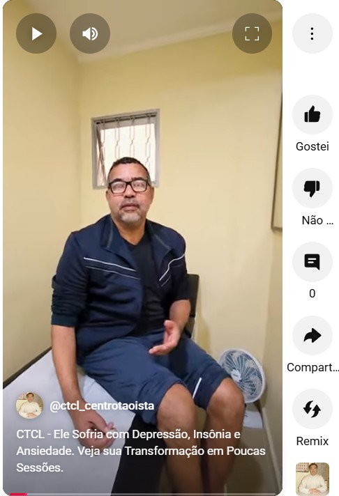 24/09/2025: Edilson enfrentava depressão profunda, insônia e ansiedade há mais de seis meses, sob uso contínuo de medicação. Por indicação da filha, iniciou nosso tratamento. Após apenas seis sessões, relata uma melhora de 70%: sono restaurado, mais disposição e alívio significativo da depressão. Seu depoimento mostra como a Acupuntura Taoista feito pelo Prof Tsai pode ser uma alternativa eficaz no cuidado da saúde mental, promovendo equilíbrio e qualidade de vida. Para maiores informações sobre tratamentos favor acesse: https://centrotaoista.com.br/acupuntura/ O CTCL desde 1998 com sede própria! Rua Senador Felício dos Santos, 410 – Liberdade – São Paulo Telefone: (11) 3271-3458 | WhatsApp:(11)98164-1338 Nosso E-Mails: contato@centrotaoista.com.br